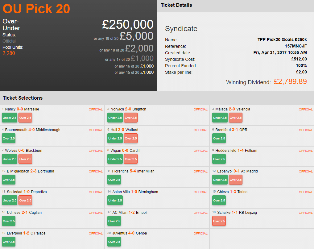 TwoPoundPunt is a regular Colossus Syndicate Captain. 117 contributions were made in his Over / Under Pick 20 Syndicate, including users from Nairabet, Merrybet, Betfair and Betdaq getting involved in the action.