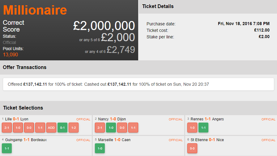 The stage was set at St Etienne for the final leg with a goalless draw the requirement. Half time came & the score was 0-0, 45 minutes of football away from the Promised Land. But our player received a cash out offer which he couldn’t turn down, £137,142. Was he mad to not keep at least part of the ticket, for a 100% cash out would also forfeit eligibility for the bonus leg? Well it seemed this gentlemen can predict the future because 18 minutes into the second half and Nice scored. Disaster averted and a £137,142 reward in the process for what ultimately was a LOSING ticket!