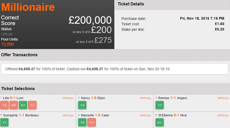 Over 13,000 units began the pool, which kicked off with a 1-0 Lyon away win on Friday. Successfully predicting a 1-0 Nancy win and 1-1 draws in Rennes vs Angers & Guingamp vs Bordeaux, one smart player was now only two legs away from winning a share of £1,000,000 and then a free chance at another £1,000,000 in the bonus fund. Little did our players know then that they would soon be receiving two incredible cash outs.