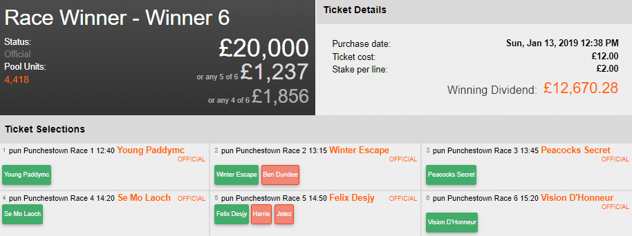 Sunday’s £20,000 Win 6 at Punchestown was won by 1.60 units, including the below story of a punter who played a £12 ticket into the pool just minutes prior to the off at 12:40 (GMT).