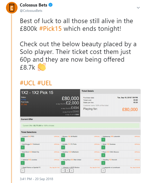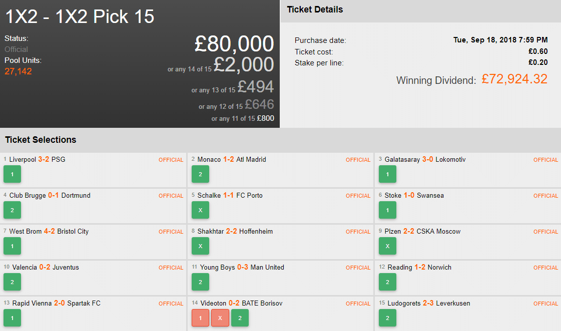 This is what we love to see here at Colossus. Small stakes tickets winning huge money. The punter’s 60p ticket involved single selections in all but one leg, making the feat even more remarkable.