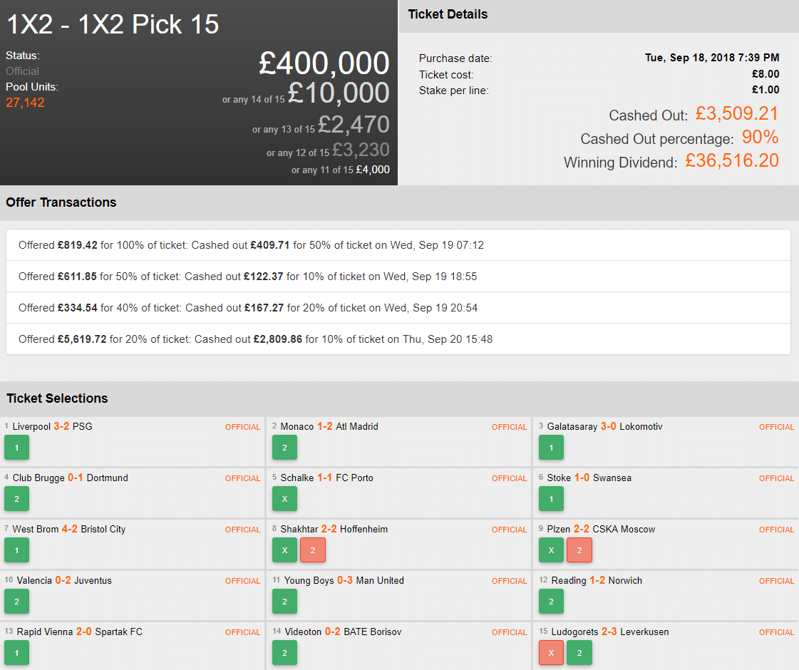 In stark contrast to the above player, the below winner played Cash Out to the tune of £3,509 whilst still receiving a Winning Dividend of £36,516 (for their remaining 10% portion) at the end of the pool.