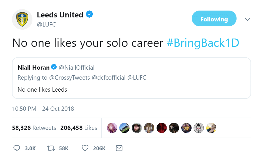 Speaking of which… Niall Horan was involved in an unlikely spat with the Leeds United Twitter account this week. The Irish musician took to the internet to praise the football of Derby County after the Rams defeated West Brom by four goals to one. He was promptly invited to send some luck the way of Leeds; the former One Direction man was not impressed, succinctly declaring that “no one likes Leeds”. The Yorkshire side did not take kindly to this, and lashed out against Horan’s solo career – the social media manager was left to deal with a horde of angry fans for the next few days. Bizarre.