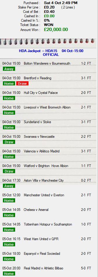This lucky ticket holder scooped a massive £70,000 from their 40p bet in the £1,000,000 HDA15. They won £20,000 from the main prize pool and £50,000 from the bonus pool the following week by selecting just one more correct outcome.