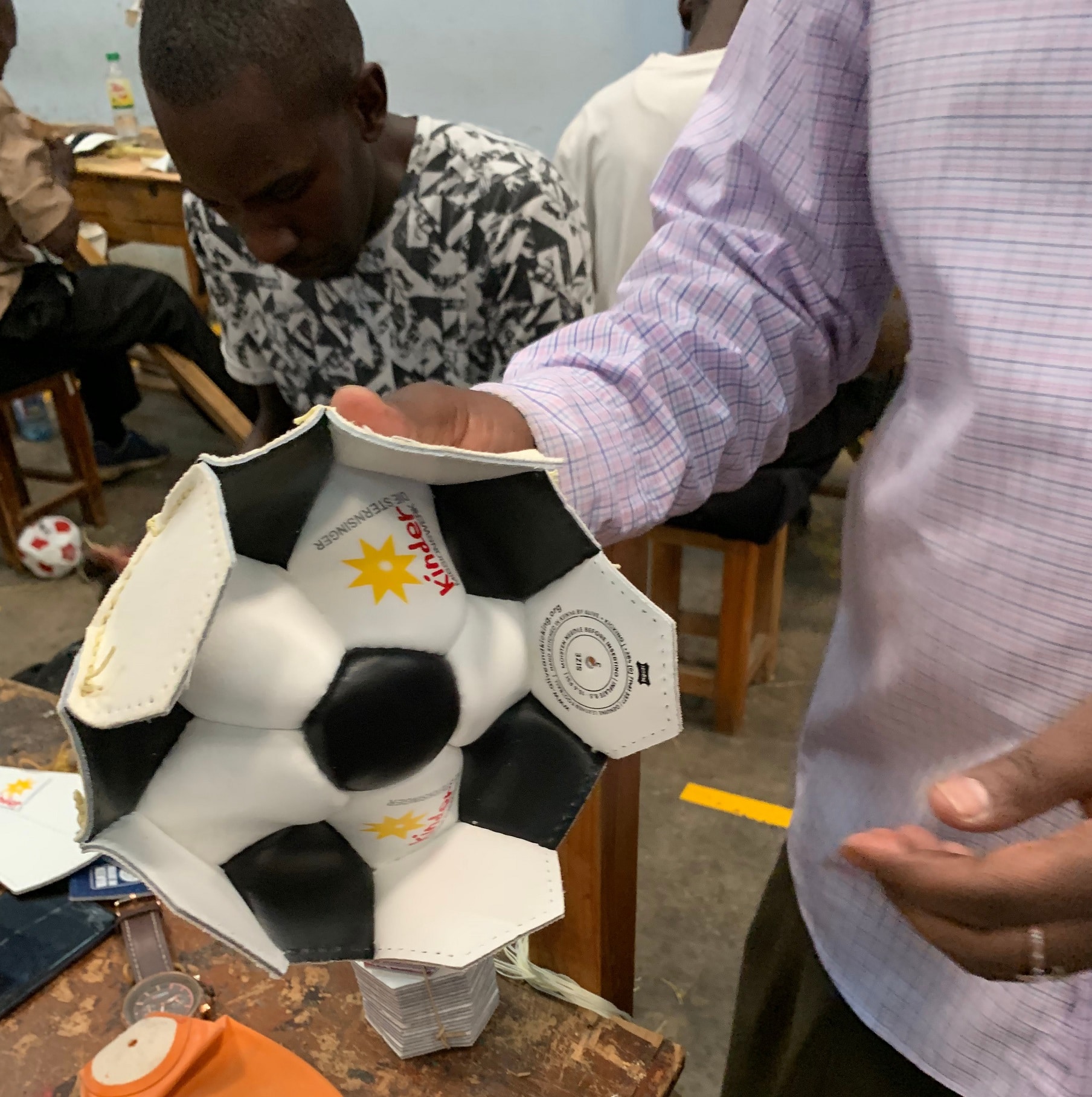 The first stage is the panel cutting. The locally sourced materials are cut into hexagon and pentagon panels to create the key shapes that form a football.