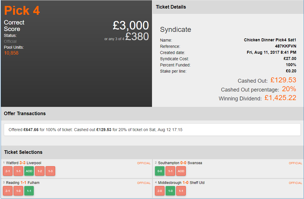 The Premier League season kicked off again at the weekend and BBTipster’s winning streak shows no sign of slowing down. Captain fantastic led his syndicate to a £1,425 win from £27. Anyone lucky enough to jump on the “Chicken Dinner Pick4 Sat1” syndicate would have made over 50 times their stake!