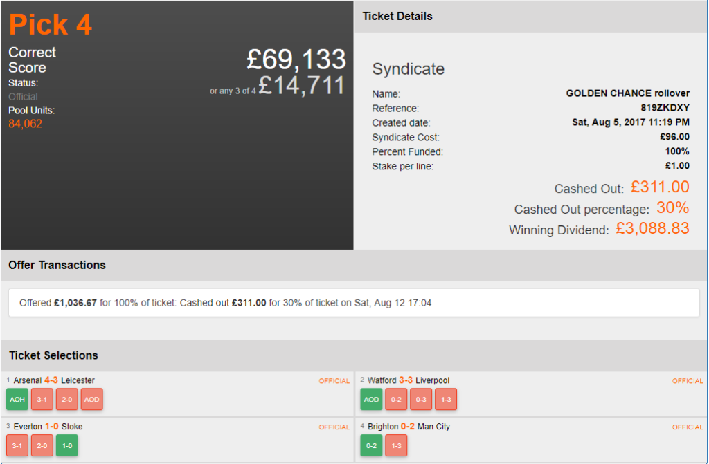 BBtipster wasn’t the only successful syndicate captain of the weekend as going for gold led two winning syndicates. His first “Golden chance rollover” turned £95.47 into £3,088.83. Arsenal’s late turnaround and Watford’s equaliser secured the first 2 legs before Everton overcame Stoke in the 3pm game. Before the Brighton game started Going for Gold cashed out 30% of the syndicate for £311. Man City went on to win 2-0 and the syndicate returned over 32 times the stake. A solid effort from captain Going for gold and he wasn’t finished there. His second syndicate “Gold P8 winner inform” had a winning dividend of £433.94 from £72 to make it 2 wins in as many days!