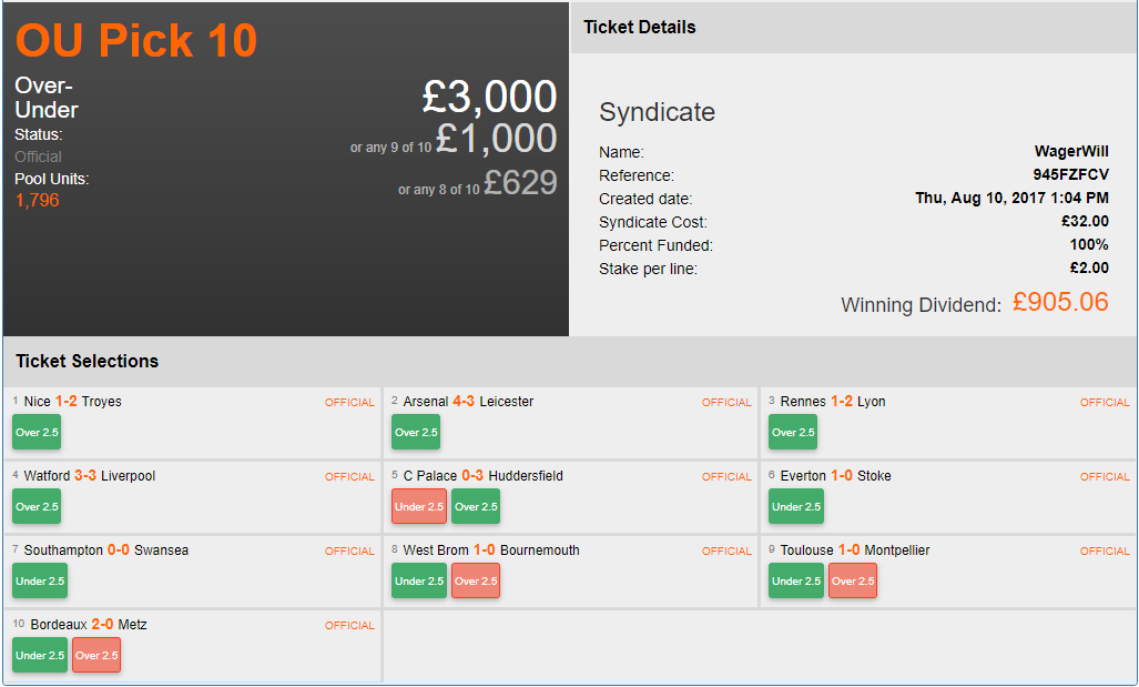 Finally, Will Wager led a £32 syndicate “WagerWill” to victory in our O/U Pick 10. The captain held his nerve resisting all cash out offers and delivered 100% of the ticket to a winning dividend of £905.06. Each member of the syndicate made over 28 times their stake.