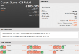 Palace would eventually nick a point courtesy of a Wilfried Zaha strike but it mattered little to the 27 contributors to the Syndicate who were jubilant at their Captain’s Cash Out decision, earning them €7,618 for a ticket that would had been worth a mere €201.