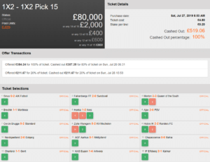 As such the player was offered £384 for the ticket, roughly 77x their initial investment. The offer proved too good to resist and they opted for a partial Cash Out, selling 80% of the ticket for a return of £307.