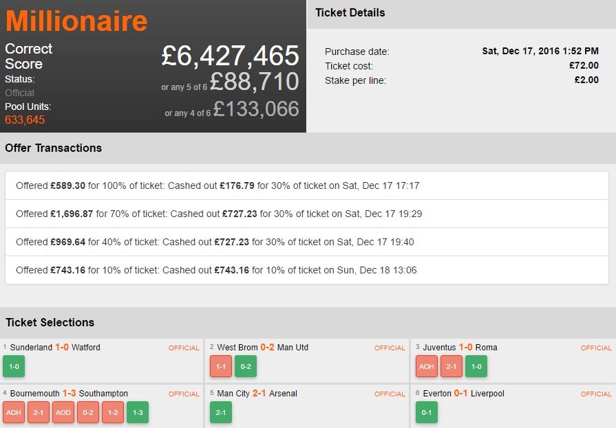 This customer cashed out all of this ticket for £2,374.41. However, had they not cashed out, the ticket would be worth £4,667,431 and would have a shot at the bonus leg fund of £1,293,291. Never has a person been more distraught at banking over £2,300!