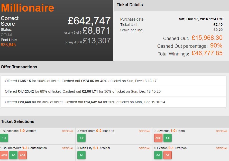 This customer cashed out 90% of their ticket for £15,968.30. But by keeping 10% live into the final leg, they increased their total winnings to £46,777.85 AND a chance at the bonus leg! To win the bonus leg, they need to make the correct selection in only one game- Inter Milan vs Lazio on Wednesday, December 21st at 19:45. You can see our bonus leg selections here.