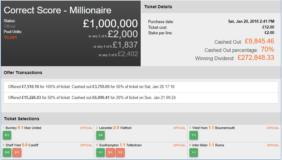 With just under £10k in the bank from Cash Outs, a close fought scrappy 1-1 draw between Southampton and Tottenham advanced this ticket to the final leg of our Pick 6 pool. The remaining cash out offer was ignored as the final fixture between Inter Milan and Roma kicked off. With only 1-1 covered it would have been a nail-biting final 10 minutes for this punter. Roma led 1-0 before Uruguayan forward Matias Vecino netted in the 86th minute to secure the final leg of the Pick 6 pool and deliver this very happy player a juicy £280k+ win.
