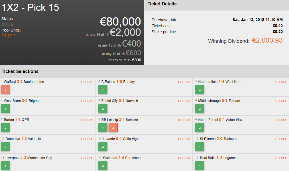 Finally for the Pick 15, a player in France who staked €0.40 was rewarded with over €2,000 in Consolations for going 14/15!