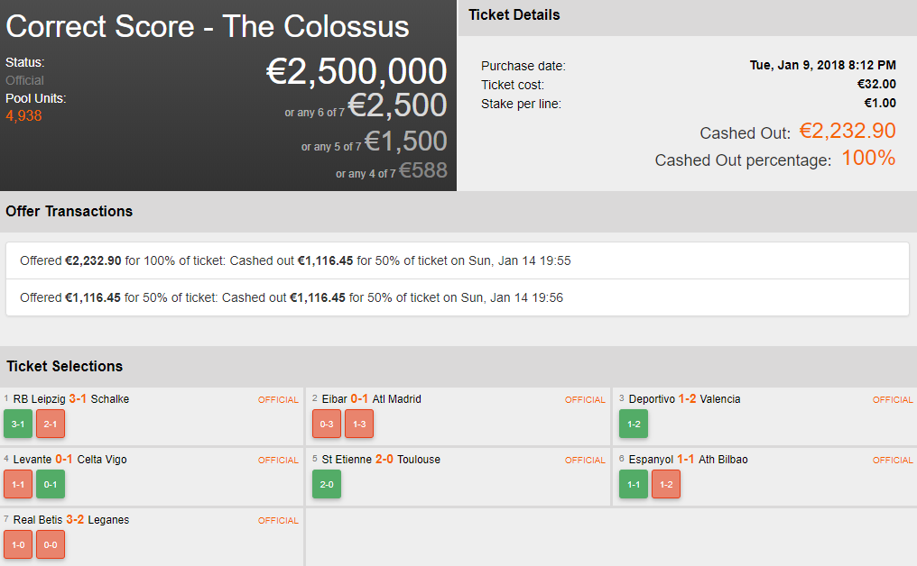 Still in the hunt for 6/7 Consolation after leg 6, they decided to cash out 50% for €1,116. Then, moments after they put an end to any tension by cashing out the remaining 50% for exactly the same, leaving them in €2,200 profit after their initial €32 outlay. It proved to be a great decision as their selections in the final leg were losing selections.