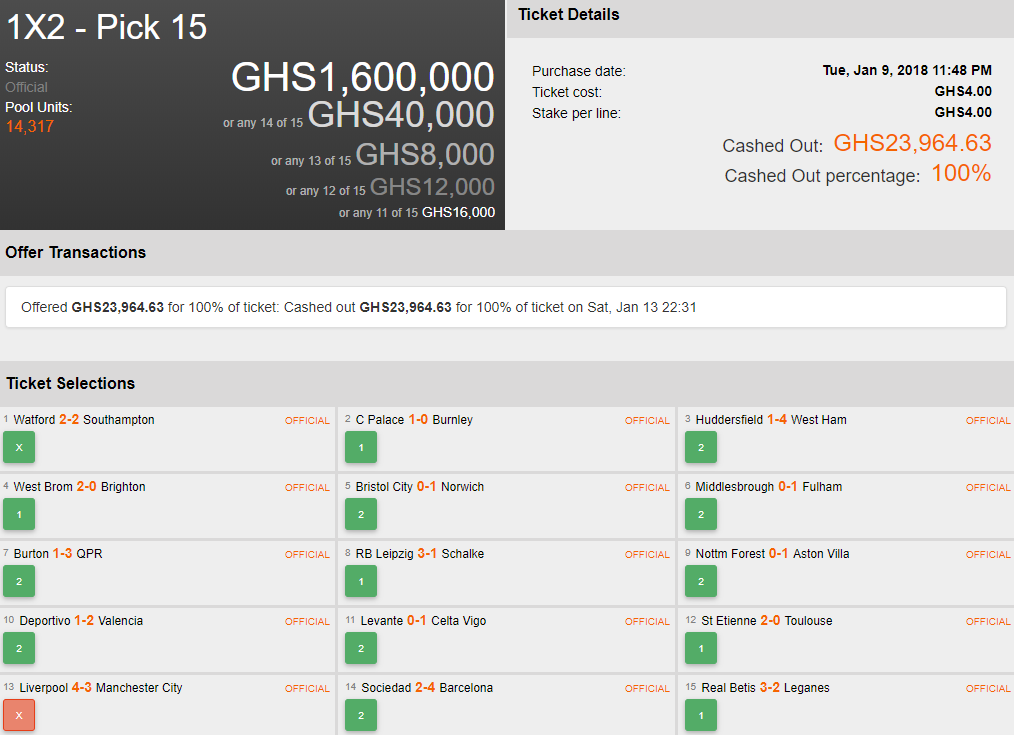 Another player let their ticket run, even after losing in leg 1 as Watford were held by Southampton. It proved a smart decision as they were rewarded with roughly £6,300 in Consolation money for their great effort – scoring 14/15 in the end.