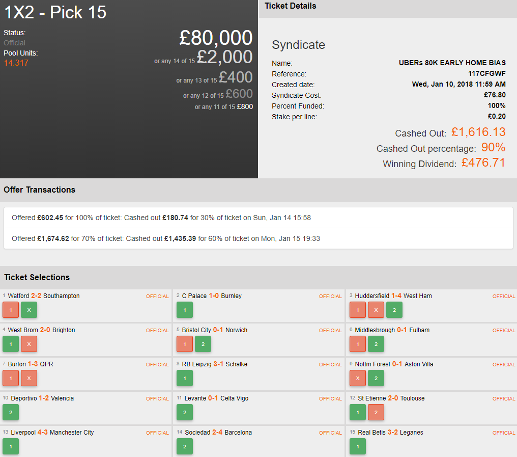 Finally for this week, UberTipsterUK launched a modest £76.80 Syndicate in our Pick 15 that was shooting for £80,000. A couple of cash-outs for a combined £1,616 guaranteed everyone involved a healthy profit. With only one blemish on the ticket at the end of the pool, their remaining 10% earned them another £476, resulting in a total of nearly £2,100 overall! Super stuff.