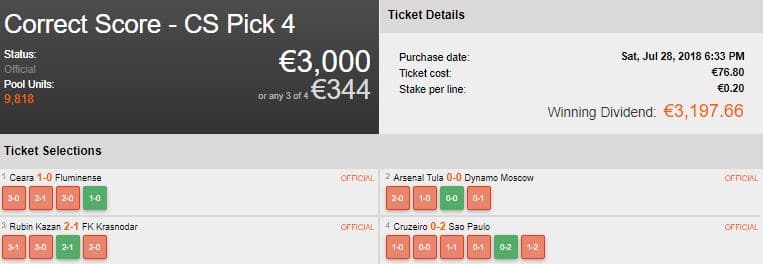 For those that enjoy having a crack at the football during the summer (and we’re not talking about the major tournaments here), you need to be pretty in tune with your Brazilian and Russian footy if you’re going to nail a Correct Score Pick 4. Credit to this Solo player from Finland who did exactly that – playing a 4x4x4x6 €0.20 stake per line ticket, they turned their €76.80 ticket into €3,197!