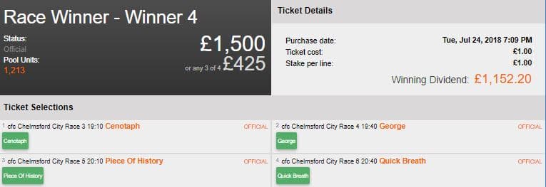 Back to the racing and what an effort this is. For the same price you’d pay for a shopping trolley deposit at your local supermarket, this punter filled their basket with £1,152 once the 20:40 race had finished. That’s a proper big shop right there!