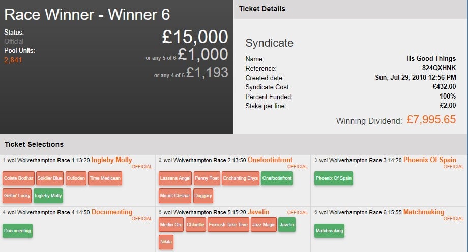 Sunday’s Wolverhampton card had some added spice for Syndicate Captain Heston and their members. Going for bankers in legs 3, 4 and 6, then crucially picking several selections in legs 1, 2 and 5, it turned out to be a masterstroke as Matchmaking brought home the bacon in the final leg for a £7,995 win!