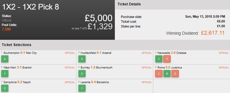 This punter’s £8 ticket managed to net him just over £2,900 when he had green selections in every leg. No landed, quite surprisingly, in the last three fixtures: Southampton v Man City, Roma v Juventus and Sampdoria v Napoli. If you think something is not as likely as it looks, the nature of pools betting means that if it happens you will be in with a chance of returns like this!