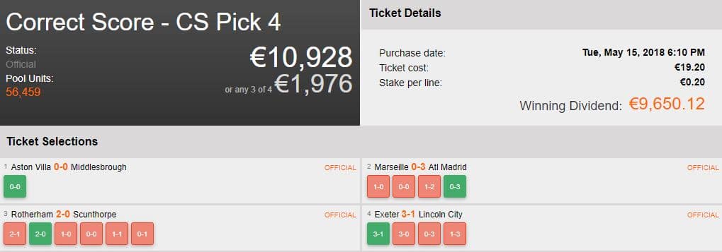 Our almost weekly Pick 4 Rollover was an interesting array of fixtures last week. We had all three fixtures from the Football League Play-Offs alongside the Europa League final. This punter managed to bag €9,650 after predicting some unlikely scorelines, off a €19.20 bet! Marseille 0-3 Atletico Madrid was a unit buster and so was Exeter 3-1 Lincoln City, but this player made it through!