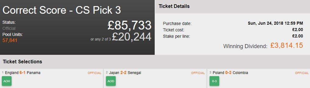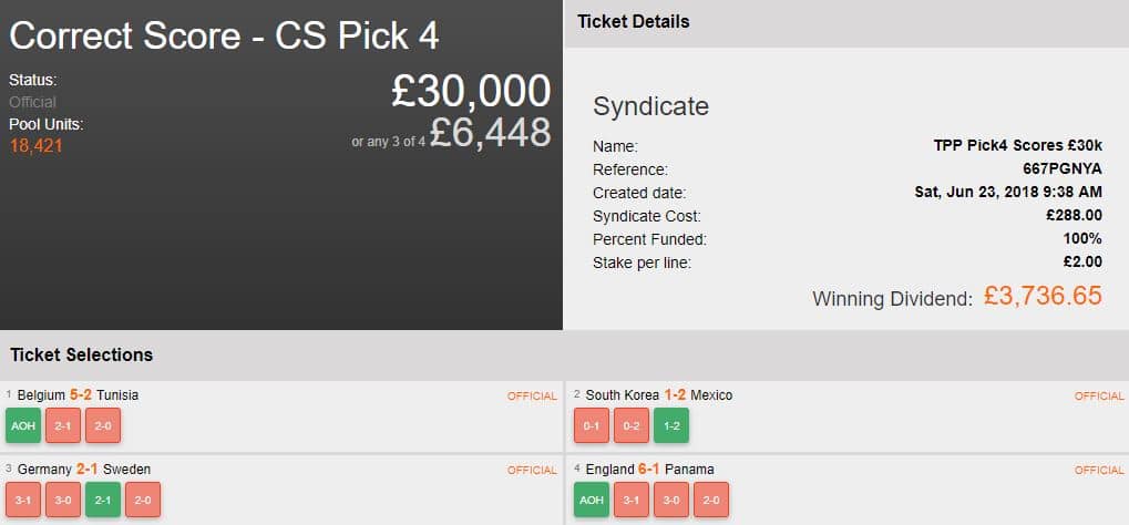 Sometime’s when you look at a ticket with the benefit of hindsight it looks so easy! TPP correctly predicts two hammerings from Belgium and England, alongside two tight affairs between Germany v Sweden and South Korea v Mexico. These scores netted his Syndicate a cool £3,736.