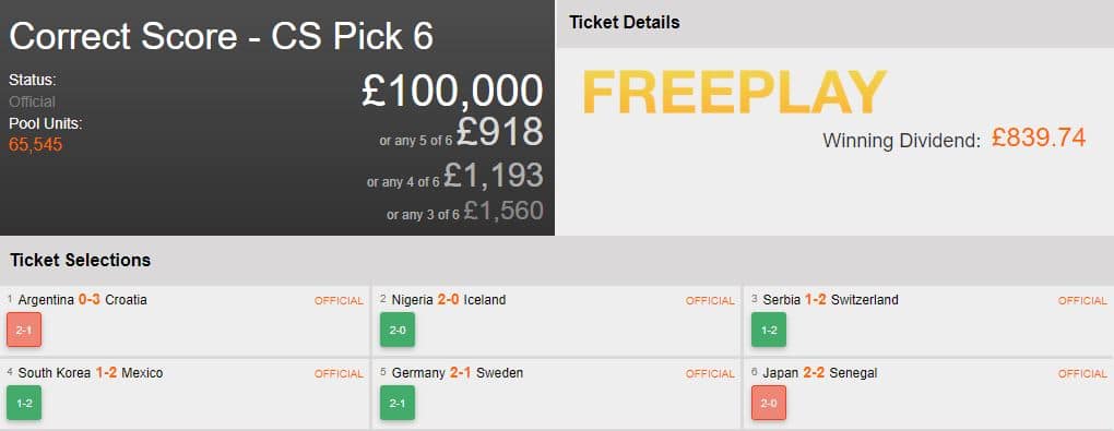 This Betfair punter did not predict Croatia beating Argentina 3-0 on his FreePlay ticket… Not many people did! What they did do is go on to get 4/6 correct, netting £839 off a free bet. So when you see that little FreePlay notification, it can be worth those few seconds it takes to place them!