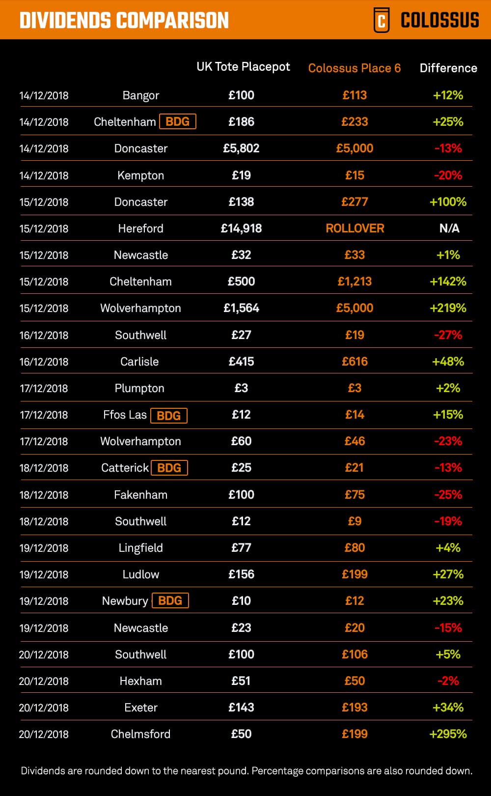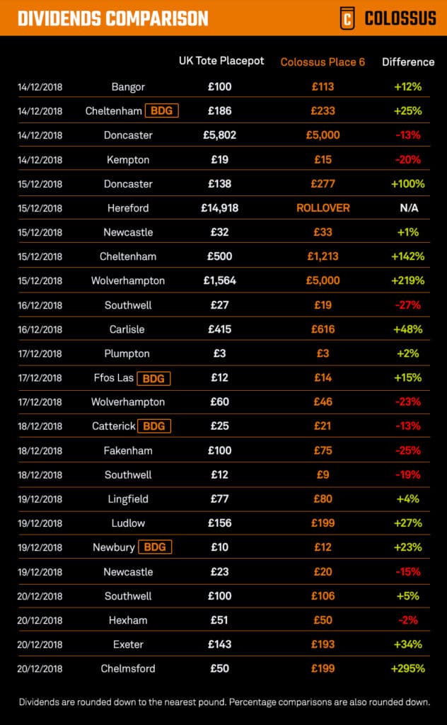 Furthermore, our Best Dividend Guaranteed (BDG) offer – applied to selected Place 6 pools – means that if our payout is beaten by the UK Tote Placepot, we will top-up the accounts of winners of our Place 6 to match that paid by the competition.