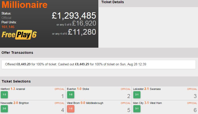 Not only can you play for over a MILLION quid for free with Colossus – you also get the option of leg by leg Cash Out and when this player was 4/4 on Sunday afternoon with an offer of £8,449.29, it was just too hard to say no. This FreePlay6 Cash Out nets punter £8,449!