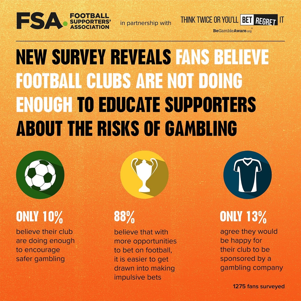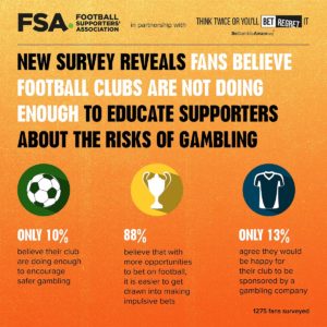 A new survey carried out by the Football Supporters’ Association (FSA) in conjunction with GambleAware’s safer gambling ‘Bet Regret’ campaign has found that football clubs have to do much