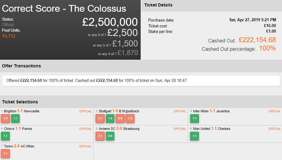 It’s tough to envisage how the player felt at that moment, knowing that they had turned £16 into £222,154, on a ticket that was worth a fraction of that. If ever a ticket demonstrated the value of Cash Out, this Colossus ticket was it.