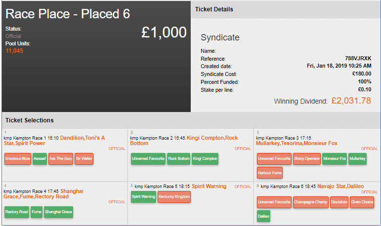 The Place 6 at Kempton provided a great start to the weekend for MLT and everyone involved in his Syndicate. Leg 1 saw a single selection progress thanks to non-runner (Awsaaf) changing to the favourite, Spirit Power. Things began to improve in leg 2 when both selections and an unnamed fav (Rock Bottom) placed, to give the Syndicate 3 lines going into leg 3.