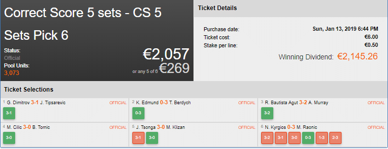 The return of our tennis pools at the Australian open saw one punter serve up €2,145 from just a €6 ticket! This player managed to navigate their way to leg 5 on just a single line, correctly predicting wins for Dimitrov, Edmund, Bautista Agut and Cilic. Leg 6 had all selections covered, so Tsongas 3-0 victory over Klizan in leg 5 would have relieved all nerves for this player.