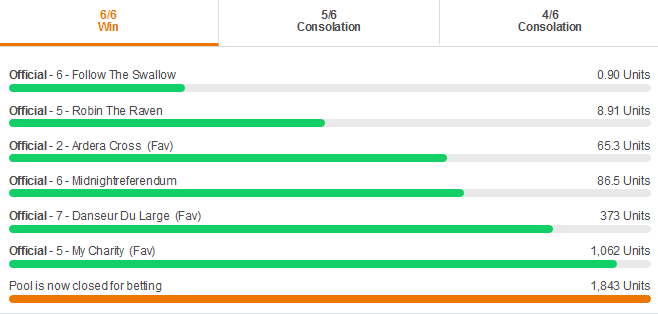 The player opted to invest in five €1 lines for the pool, meaning that they were playing for half of the £10,276 prize. Remarkably though, they seemed in no doubt about the result in five of the six legs, only selecting multiple horses in one.