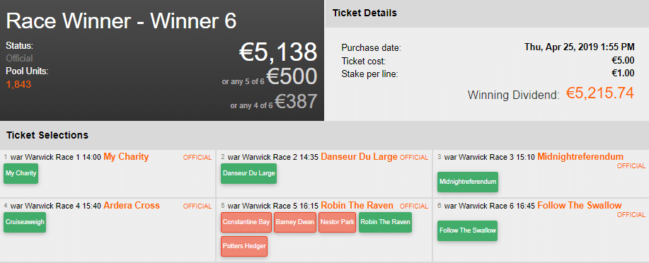 One mystic player pulled off an extraordinary feat in the Warwick Win 6 racing pool on Thursday, by turning €5 into €5,215.74. Here’s how it happened.