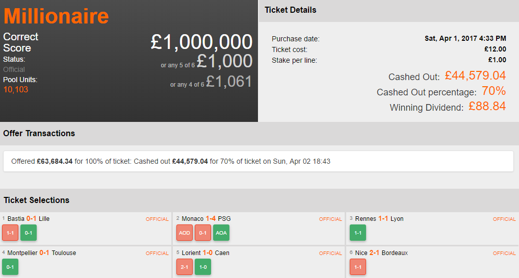 Our French Millionaire pool has provided another Colossus Cash Out success story. This customer came away with £44,667.88 from a £12 losing bet! We’ll review the tale of the ticket below…