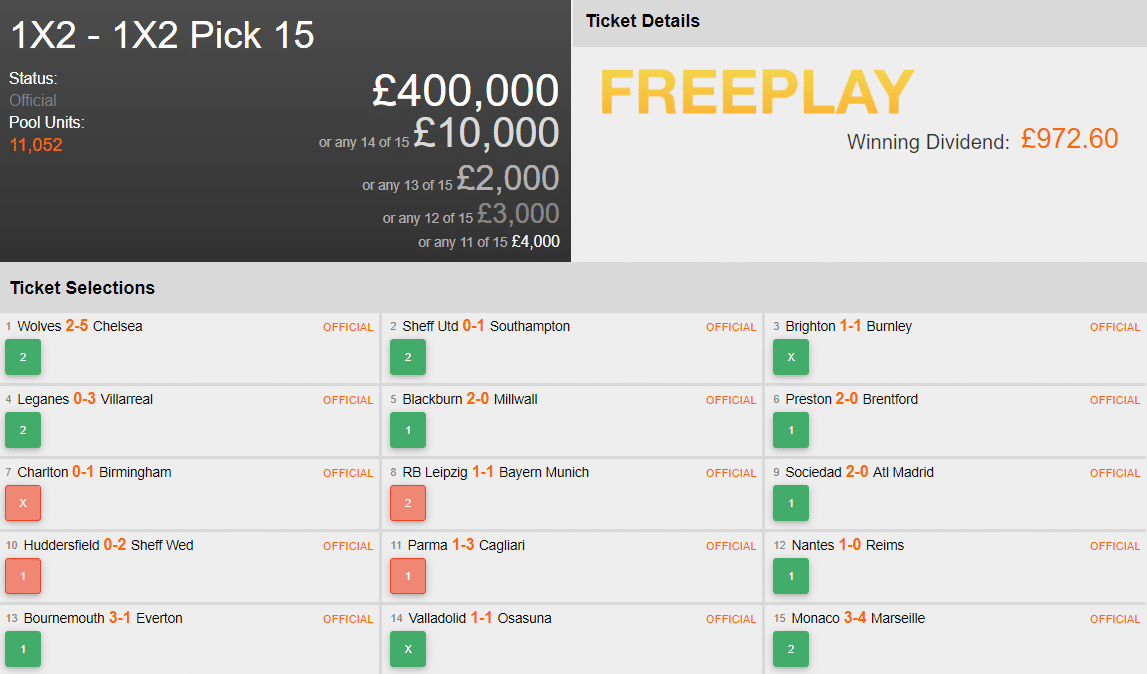 As a result of Marseille’s heroics, the player landed a cool £972, a decent share of the £8,000 Consolation pot for tickets with 11 correct legs.
