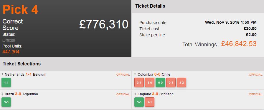 That final game happened to be England v Scotland and our customer had both 3-0 and 2-1 wins to England selected. One can only imagine the scenes of celebration that must have ensued as England ran out 3-0 winners on Friday night. £46,842 pay-out from a £20 spend. Easy.
