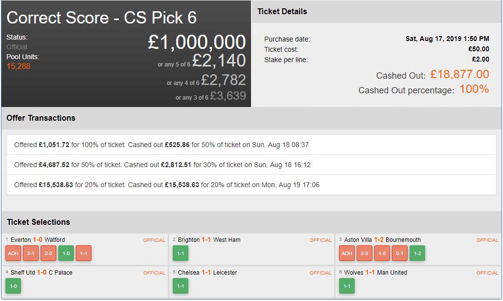 Had they decided not to Cash Out that final 20%, it would have been worth around £138,000. Even more amazingly, with all six correct scores on their ticket, if the player had resisted Cashing Out at all, they would have won a staggering £690,000.