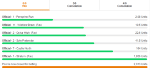 The third leg saw another three-quarters of the remaining units fall, as 5/1 second favourite Sole Pretender won comfortably having led for much of the race. The horse was aptly named as it was the sole selection our player had made on their ticket, meaning they were through to the fourth leg unscathed.