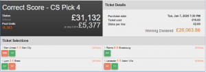 A Colossus player landed an extraordinary win on Wednesday night when they took down the Rollover Correct Score – Pick 4 pool which had reached a massive £31,132.