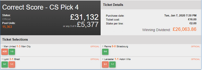 The eight line Correct Score ticket began on Tuesday evening as Manchester United entertained their fierce rivals Manchester City in the EFL Cup and Reims hosted Strasbourg in the French League Cup.