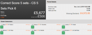 Things could hardly be more finely balanced. If Khachanov could triumph in the fourth set, the ticket would be home and he didn’t disappoint. Having broken Del Potro in the second game, he held own serve to win the set and the match. The ticket was home and, sensationally, a £1 stake had been turned into a whopping £4,972.85.