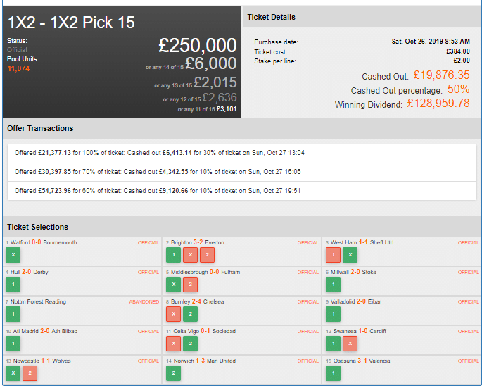 Swansea duly obliged and, when Wolves salvaged a late draw away to Newcastle, an improved offer of £30,397 rolled in for the remaining 70%. The player sold another 10% which added a further £4,342 to their total but, with just two legs remaining and 60% of their ticket still active, just how much better could it get?