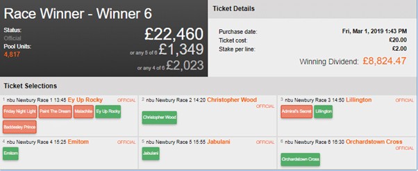 Last Friday saw the Win 6 rollover won by 2.6 units, producing a £8,824 dividend for 6/6 correct selections. This punter played just 10 lines, and scored the massive win that all horse racing punters dream of. 11/1 outsider Ey Up Rocky became the 1st win of the pool, knocking the pool down to a small share of units as 7/4 Fav Crystal Lad was nowhere to be seen. Cruising through the legs, with an excellent choice of slight outsiders Lillington and Jubilani, meant they were looking strong for the final leg. With the favourite Orchardstown Cross storming home by 6 lengths, this player had no fear (they ignored Cash Out offers throughout the pool), letting it all ride and reaping the rewards. A magnificent feat and we congratulate them on the win.
