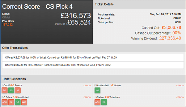 When it came to half time during legs 3 and 4, a further 40% was taken to secure an additional £548, meaning this player had over £3,000 safe and sound, with 10% left to go for a share of the top prize. When the final whistle blew, Chelsea and Manchester Utd wins (2-0 and 3-1 respectively) saw this player go 4/4. We cannot imagine the delight of this punter when they saw a dividend of £27,336 come into their account, on top of their Cash Out.
