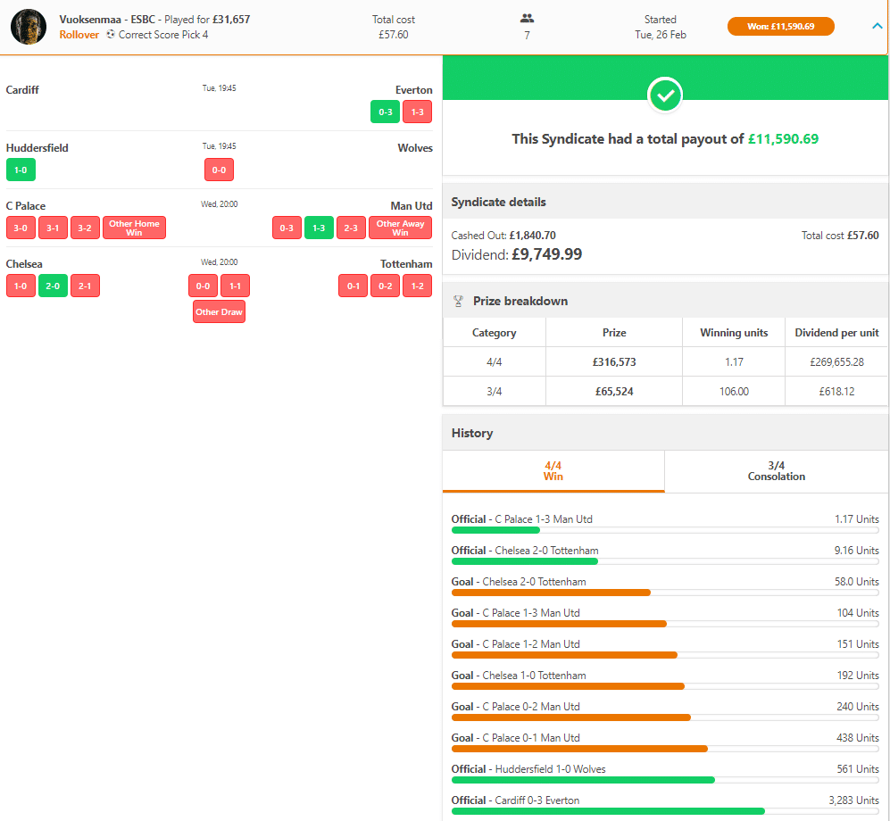 With risk, though, you can be rewarded. And it seemed to pay off well for the Finnish Captain. Making it through the first 2 legs gave the Syndicate a spectacular Cash Out offer, of which he took 30%, securing himself and the rest of his contributors over £990 at the halfway point in the pool. During legs 3 and 4, he decided to take another 30% for £828, meaning no matter the results, they were guaranteed a return of over £1,800.