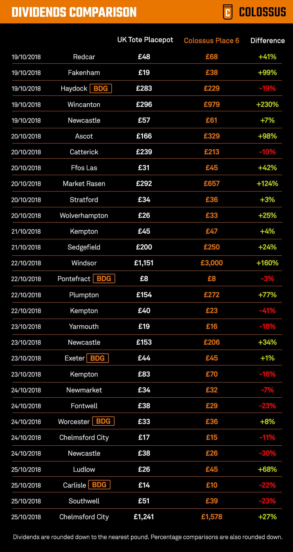 RACING UK TOTE PLACEPOT VS COLOSSUS PLACE 6 – WEEK 15 DIVIDENDS COMPARISON