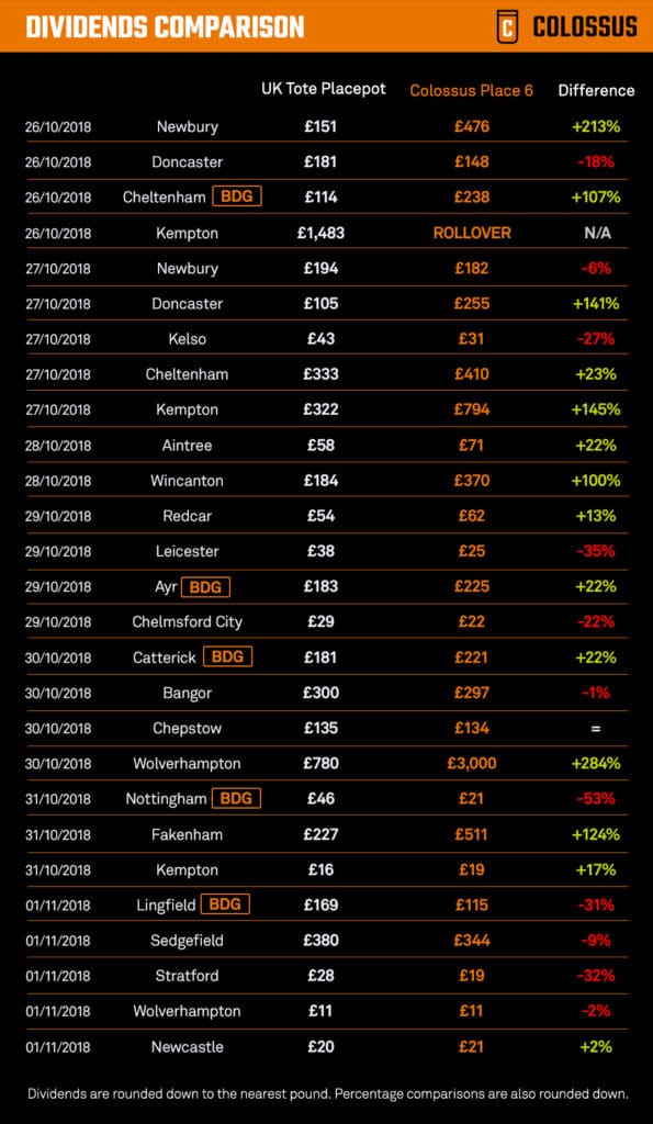 In the period between 15.10.2018 – 01.11.2018, we have declared fourteen Place 6 pools as Best Dividend guaranteed. Of those 14 pools, we have had to make up the difference to match the dividend of the UK Tote Placepot in eight.